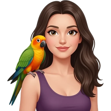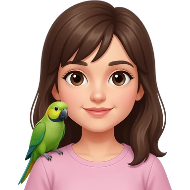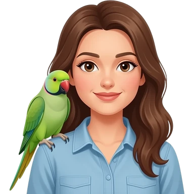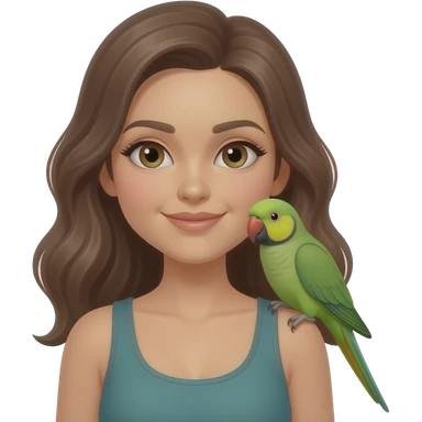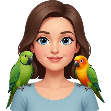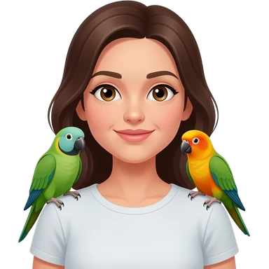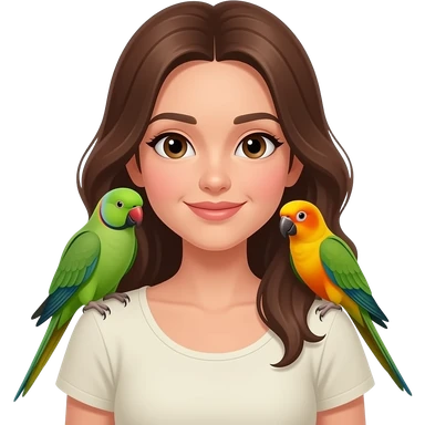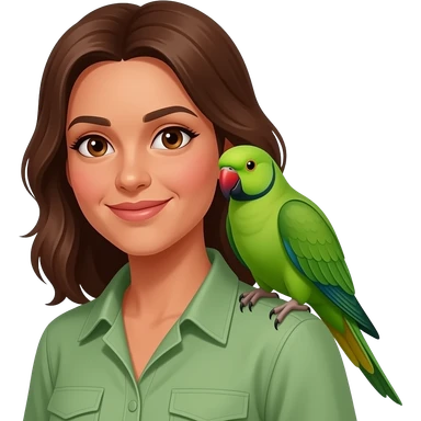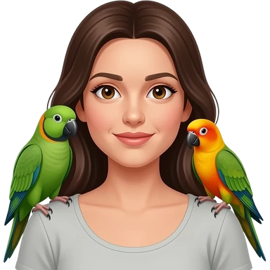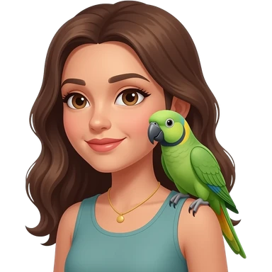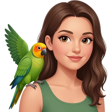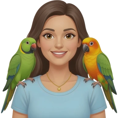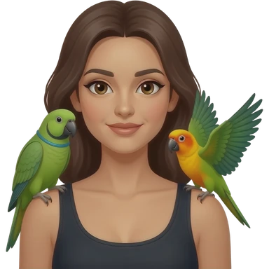 green indian ring neck parrot on a brown haired womans shoulder with a sun conure parrot with all green wings on her other shoulder the woman is wearing a necklace emoji | AI Emoji Generator