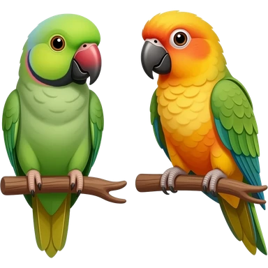 green indian ring neck parrot beside a sun conure parrot with all green wings emoji