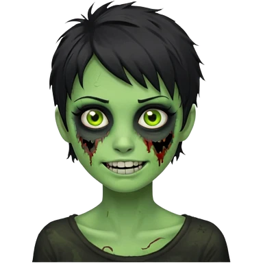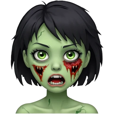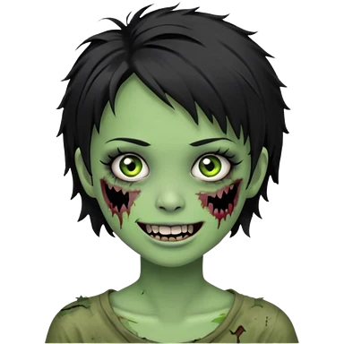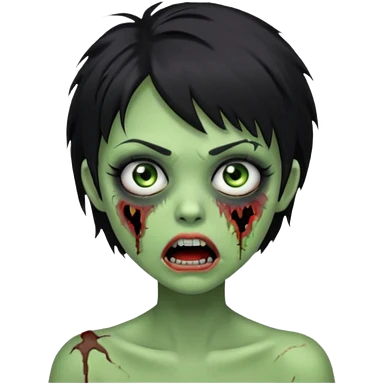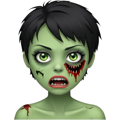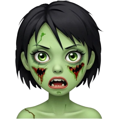 Green zombie girl with messy black short hair with lashes and torn cheek and open mouth emoji