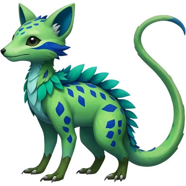 Greenish beautiful handsome gorgeous aesthetic colorful vibrant Vernid-Trico-species-Fakemon-creature by LiLaiRa, 4 legs, 1 tail, random markings, (full body) emoji