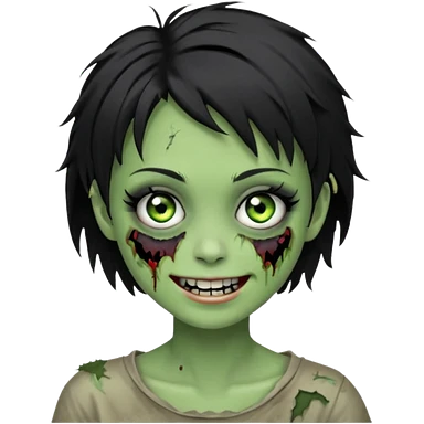 Green zombie girl with messy black short hair with lashes and torn cheek and smiling face emoji