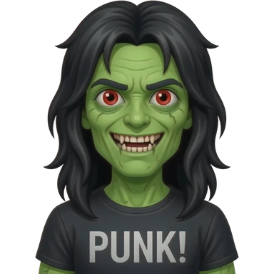 green zombie long black hair w braces and red eyes and shirt that says “punk! ” emoji
