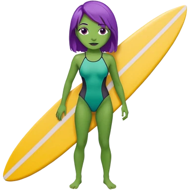 rk female surfer riding big turquoise wave, muscular green body, fierce tusked grin, sporty bikini top and board shorts, long windswept dark hair, focused eyes, surfboard under feet, minimal ocean and sky background, centered emoji, vibrant summer colors, sticker style emoji
