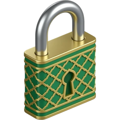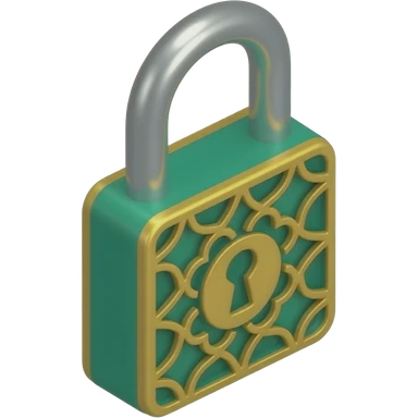 3D isometric padlock icon, engraved Mashrabiya pattern. Minimalist professional style, emerald green & gold accents. Soft studio lighting, 8k Octane render, ray-tracing detail. Isolated on white background, premium literary aesthetic --v 6.0 emoji