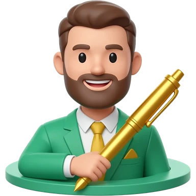 3D isometric face icon, confident smile, holding a golden pen. Minimalist professional style, emerald green & gold accents. Soft studio lighting, 8k Octane render, ray-tracing detail. Isolated on white background, premium literary aesthetic --v 6.0 emoji