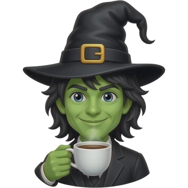 male green wizard with green skin with hat with black hair holding coffee emoji