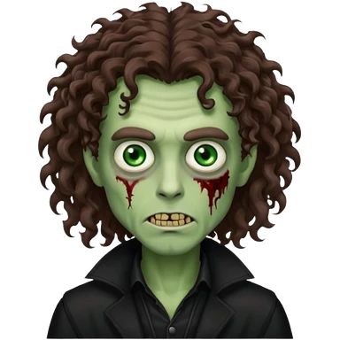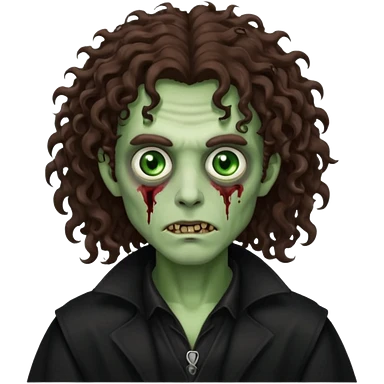 long curly haired zombie with brown hair color and green eye color, with dark vampire clothes emoji