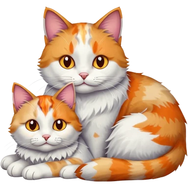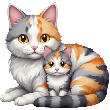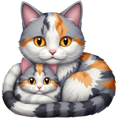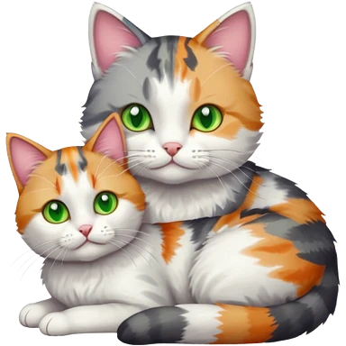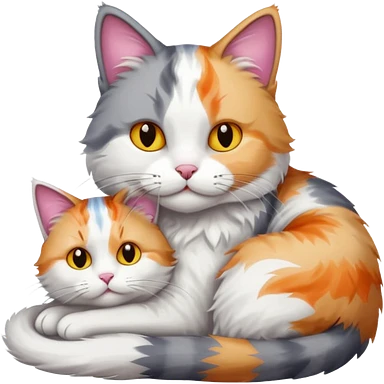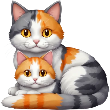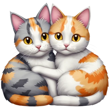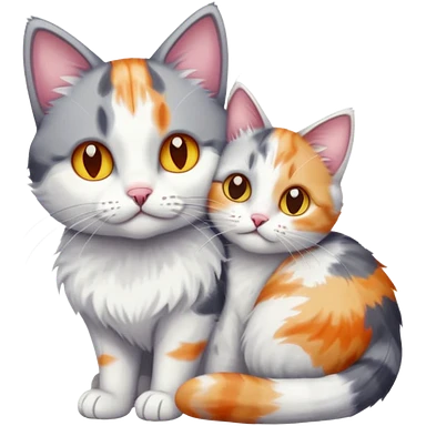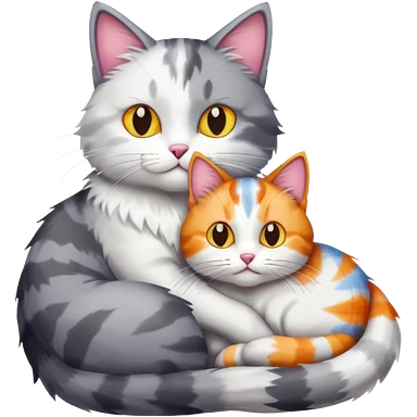grey and white cat cuddling a colourful light patched calico + white tabby cat emoji | AI Emoji Generator