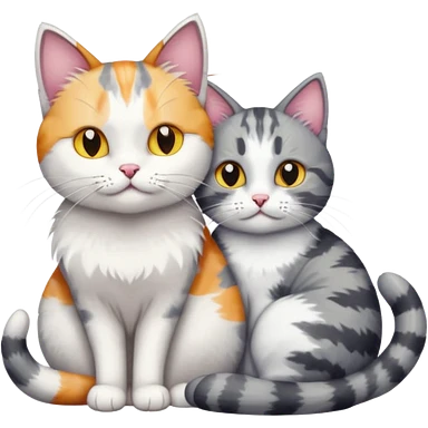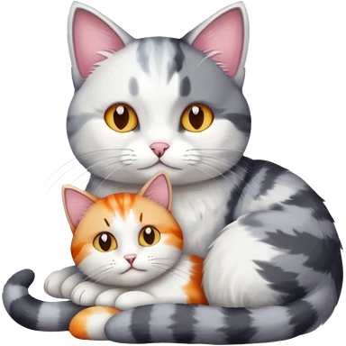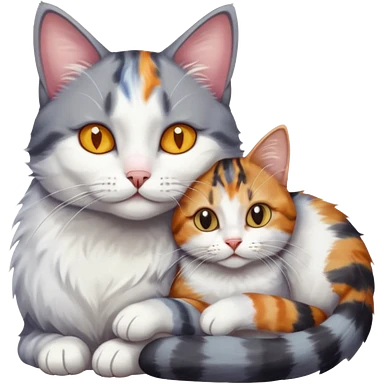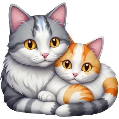 large grey and white cat cuddling a colourful light patched calico + white tabby cat emoji