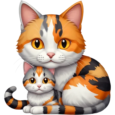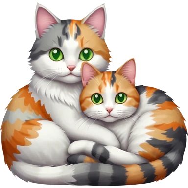big grey and white cat cuddling a colourful light patched calico + white tabby cat emoji
