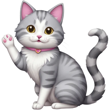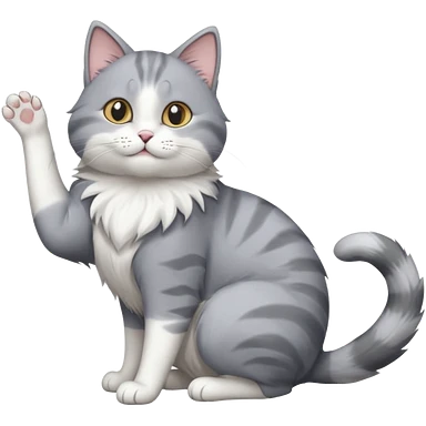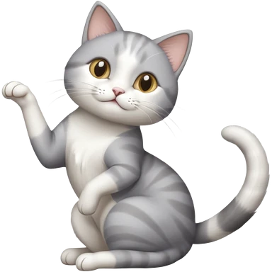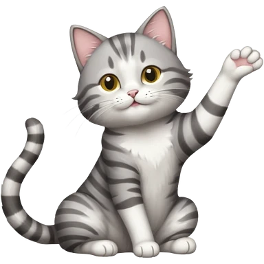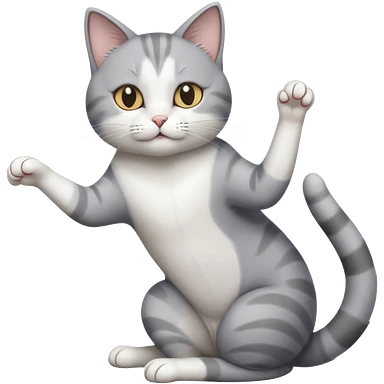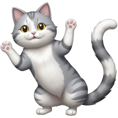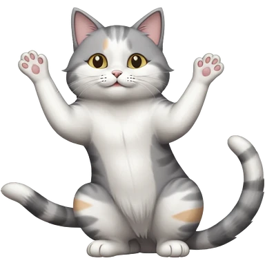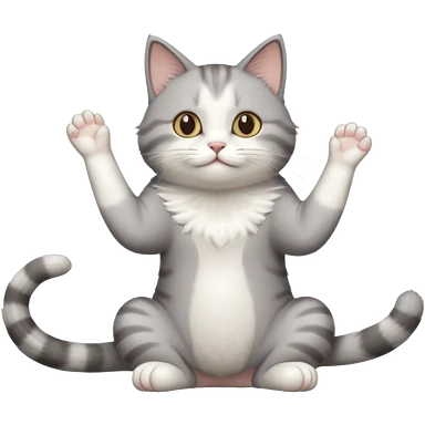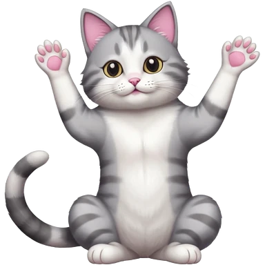 grey and white cat doing a big long stretch reaching up into the airwith arms together emoji