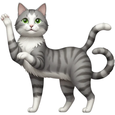 grey and white cat with green eyes doing a big extremely long stretch reaching up into the air with arms and legs side by side together straight and overextended whilst lying on its side emoji | AI Emoji Generator