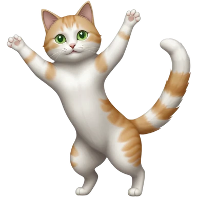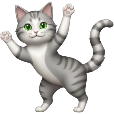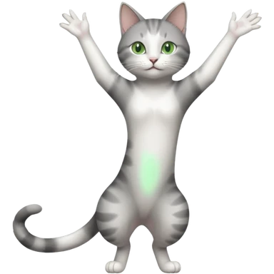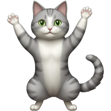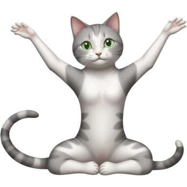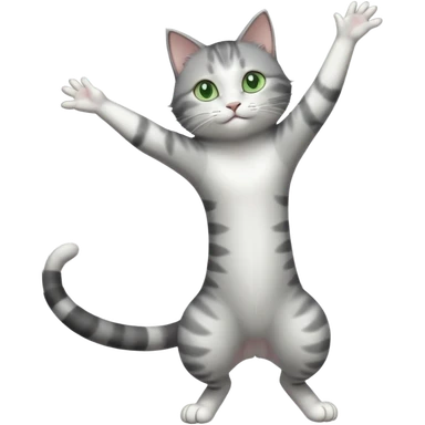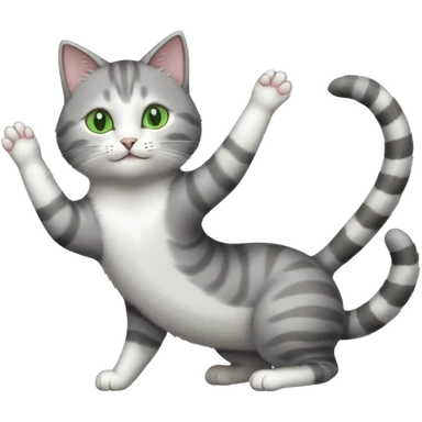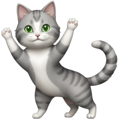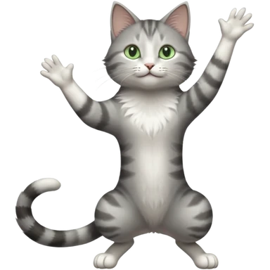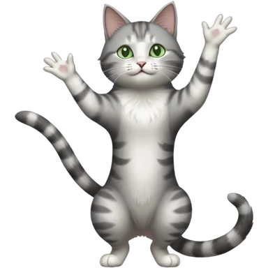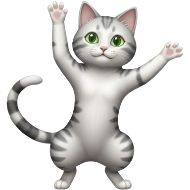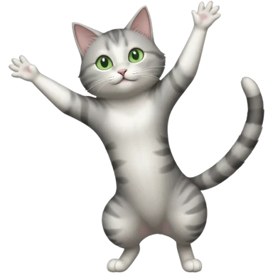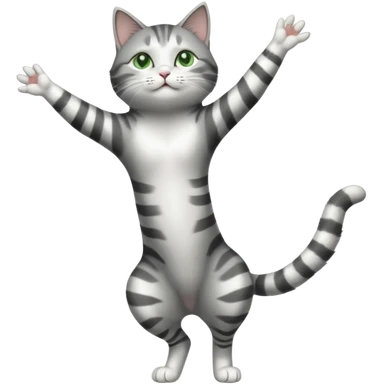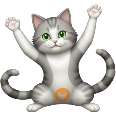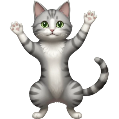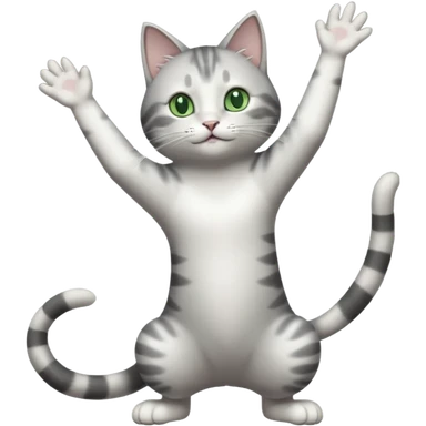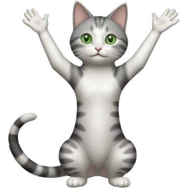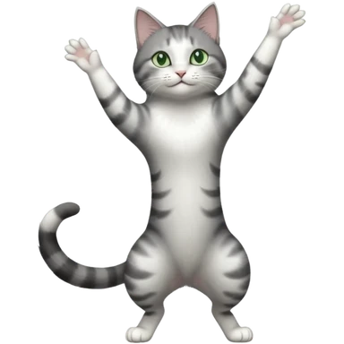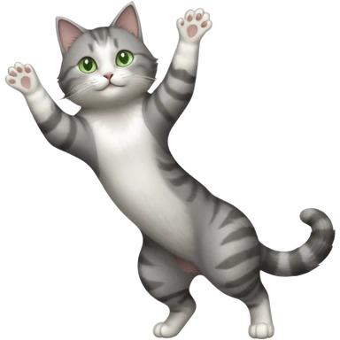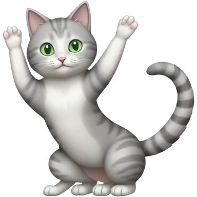 grey and white cat doing a big long stretch reaching up into the airwith arms together emoji