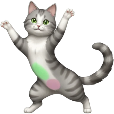 grey and white cat doing a big long stretch reaching up into the air with arms and legs together emoji