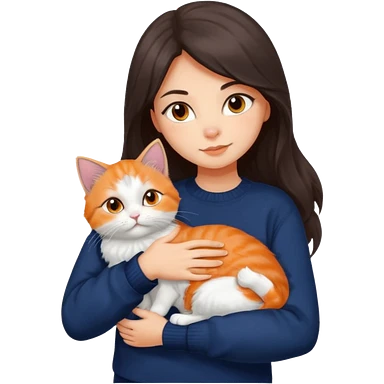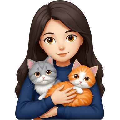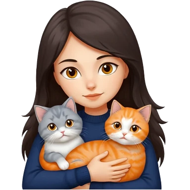 a girl with long dark brown hair, in a navy sweater, hugs a persian peaknose grey cat and persian peaknose orange and white kitten and a persion peaknose brown tabby and white cat emoji