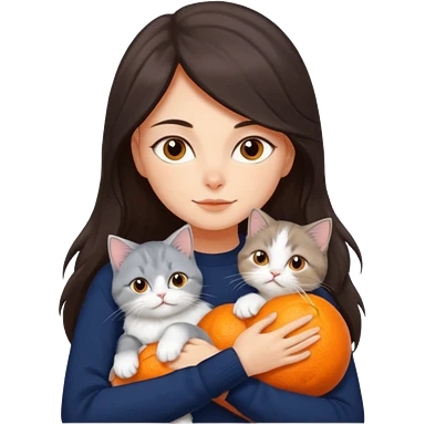 a girl with long dark brown hair, in a navy sweater, hugs a persian peaknose grey cat and persian peaknose orange and white kitten emoji