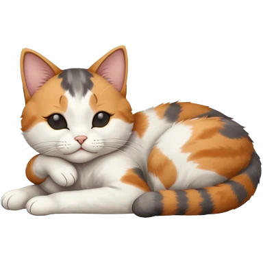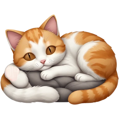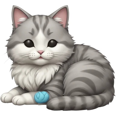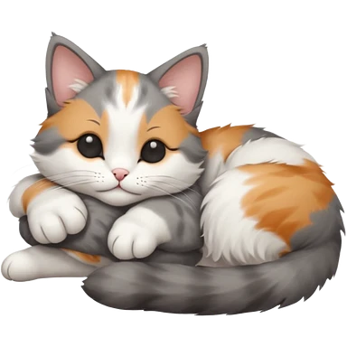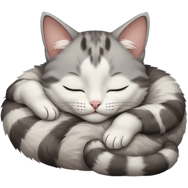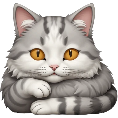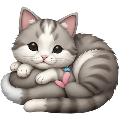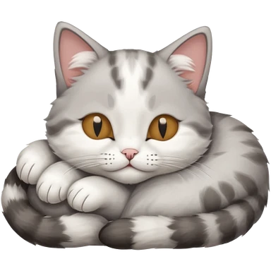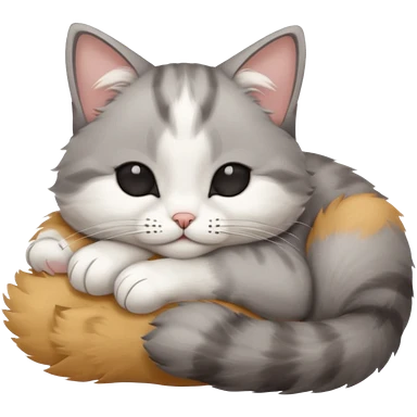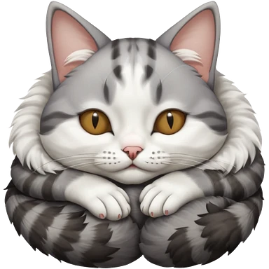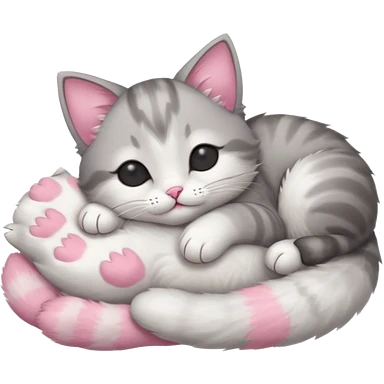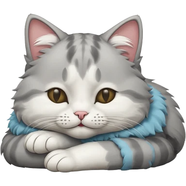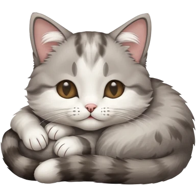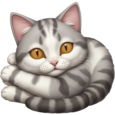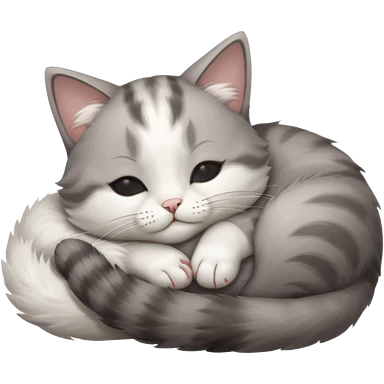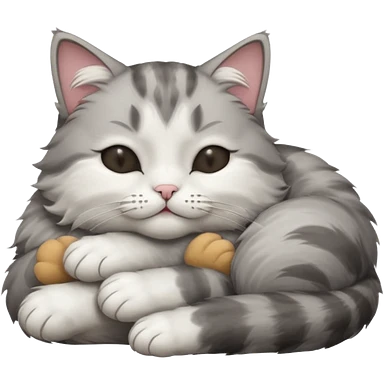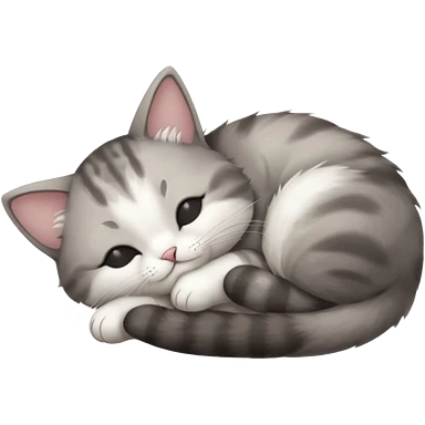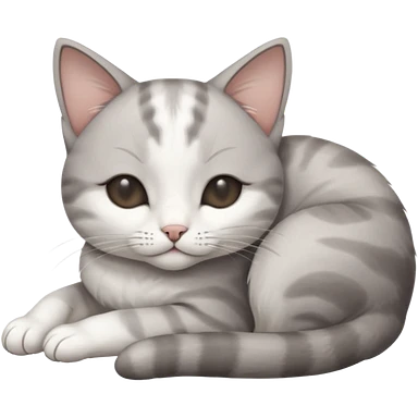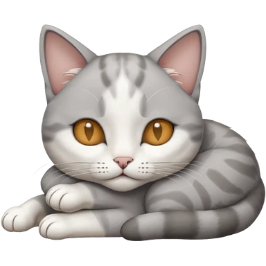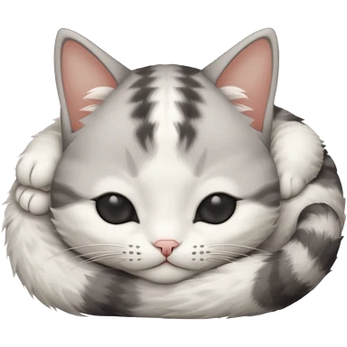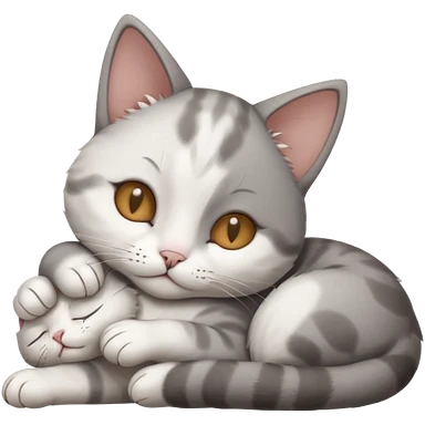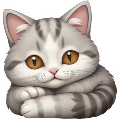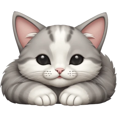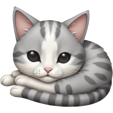 grey and white small cat with eyes closed lying down with its head resting own paw emoji