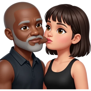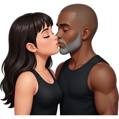 Mexican girl with bangs and a little chubby, kissing black man with grey beard td bald. No head band and wearing a black tank top. emoji