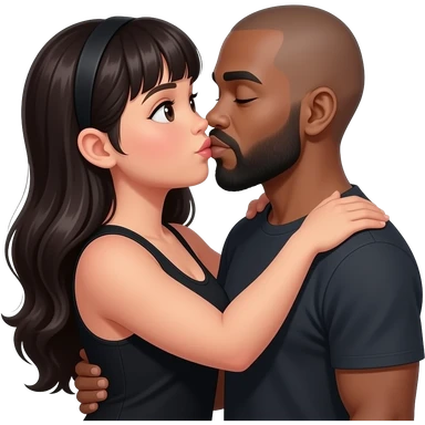 Mexican girl with bangs and a little chubby, kissing black man with grey beard td bald. No head band and wearing a black tank top. Girl has muscular arms and long hair. Man is a little lighter skinned. emoji