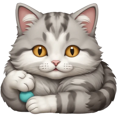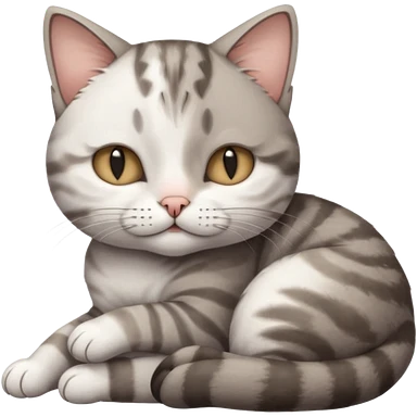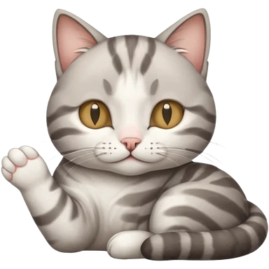 grey and white small cat with its eyes closed lying down with its paw curled and holding up his head emoji