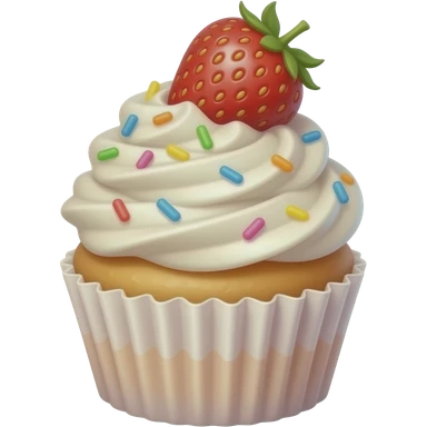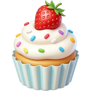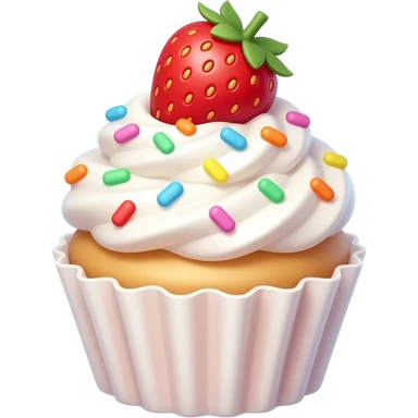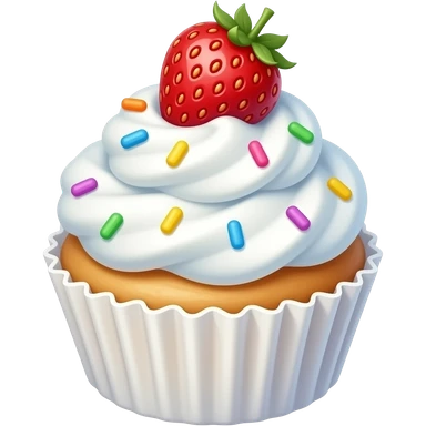 A super cute cupcake with fluffy white whipped cream, rainbow sprinkles, and a strawberry on top, kawaii style, soft pastel colors, round shapes, smooth texture, emoji design, minimal background emoji