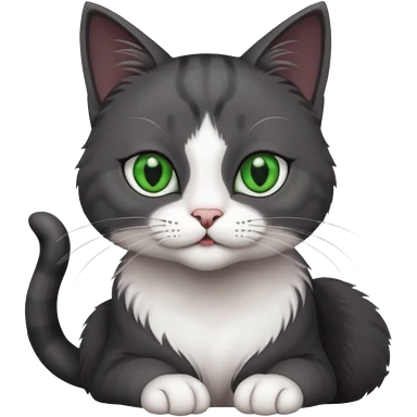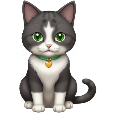 beautiful female solid dark grey cat with green eyes, white toes/paws and white patch on her chest playing emoji