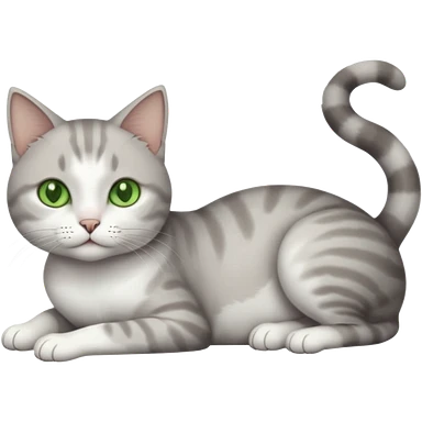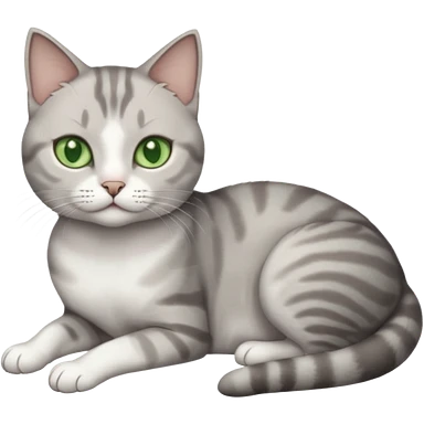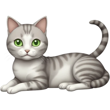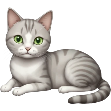 full body tiny short hair grey and white cat with white front legs and green eyes lying down emoji