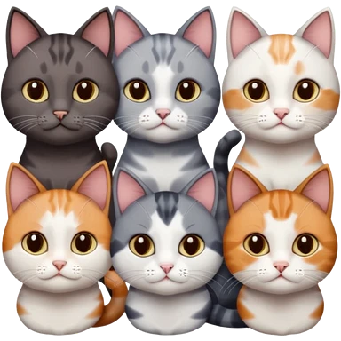 5 different coloured short haired cats including; a dark brown and white cat, and a dark grey and white, and a calico emoji