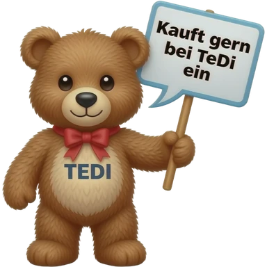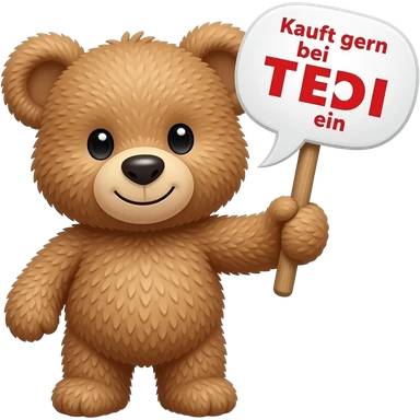einen Teddy mit einem Schild in der hand wo drauf steht „TEDI“ der teddy ist braun und sagt in einer sprechblase: „Kauft gern bei TEDI ein“ in german (deutsch) emoji