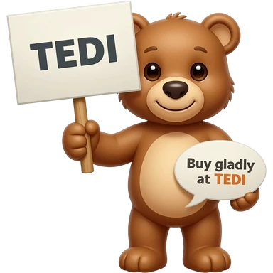 einen Teddy mit einem Schild in der hand wo drauf steht „TEDI“ der teddy ist braun und sagt in einer sprechblase: „Kauft gern bei TEDI ein“ emoji