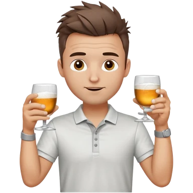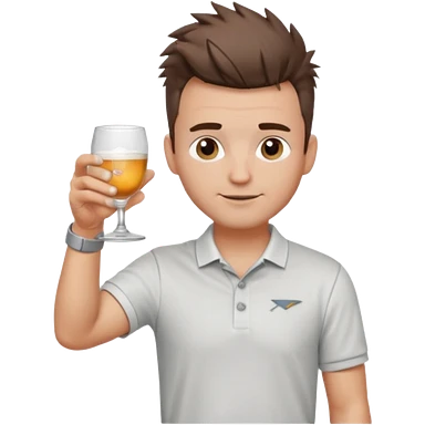 Handsome male.short messy brown hair.mowhawk hairstyle. wearing white golf shirt.grey shorts. Cheersing with a small glass. Wedding ring emoji