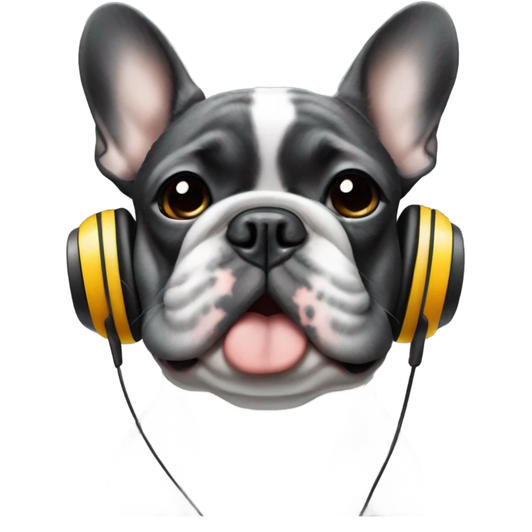 Grey hairs under chin Black less white Brindle French bulldog wearing headphones emoji | AI Emoji Generator