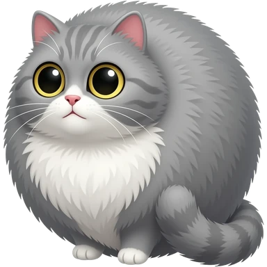 grey cat in looking like a big fluffy round ball qui a tail and big bulging eyes, white belly, cartoon style emoji
