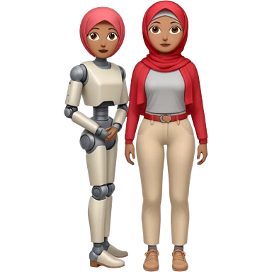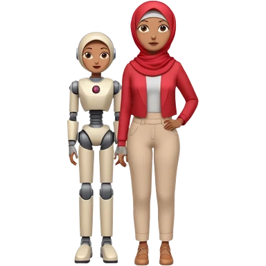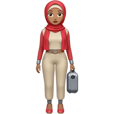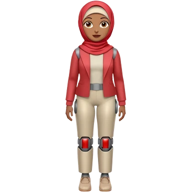 Heavy-set woman with medium-brown skin wearing a light red hijab, cream top, light red pants, tan shoes, and a grey robot leg. Standing confidently with one hand on her hip emoji