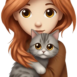 Copper red straight haired girl with dark brown eyes hugging a fluffy brown and grey Siberian cat emoji