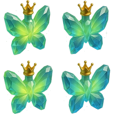 crystal luxurious butterfly-shaped bottle with a short neck and princess crown, many facets, glowing, light refractions, green (#c0ff53) and blue colors, golden details, magical effects, floating in air, transparent background, no base or shadow emoji