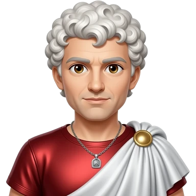 Julius Caesar with brown eyes, white curly hair, red metallic shirt, white metallic baggy pants, silver necklace emoji
