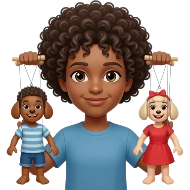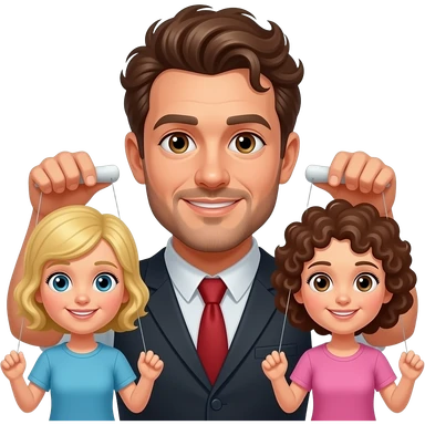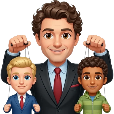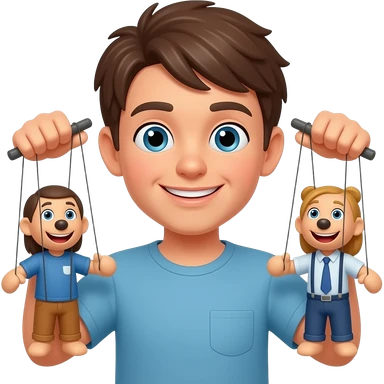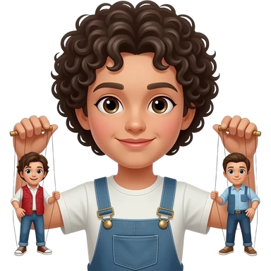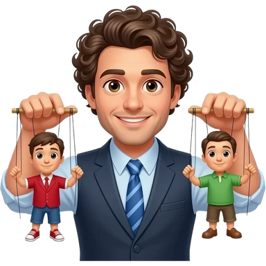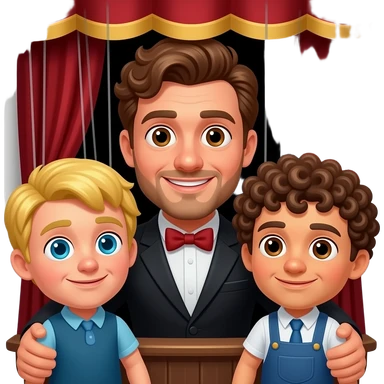 Uomo occhi marroni, capelli ricci che gestisce le sue marionette, una marionetta coi capelli biondi E occhi azzurri, l’altra capelli ricci e occhi marroni tutti e 2 maschi emoji