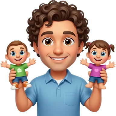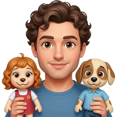 Uomo occhi marroni capelli ricci che gestisce le sue marionette, una marionetta coi capelli biondi E occhi azzurri, l’altra capelli ricci e occhi marroni tutti e 2 maschi emoji