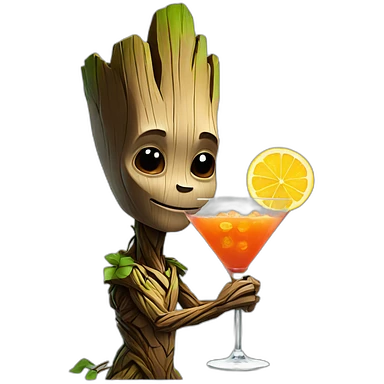 Can you make an emoji with groot from guardian of the galaxy, and groot should look like he does in the movie, with me standing next to him. I’m a white female with blonde hair and I like to wear overalls. We should be shooting galaxy guns emoji