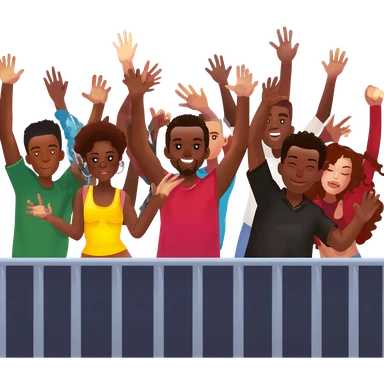 Group of African American men and women fans at hip hop concert with hands raised enjoying the music emoji