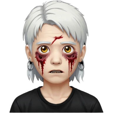 ok make a zombie avatar that has pale skin more like zombie not human, young, asian, mullet hair, white hair with hoop earrings wearing just a black T shirt white blood from the eyes, p emoji
