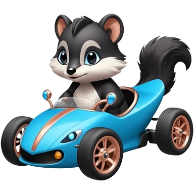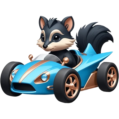 dark crystal blue and rosegold-accented faceted-body electric racing car driven by a small cute but fearless skunk with rear spoiler, roll bar, and wheely bar emoji
