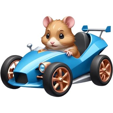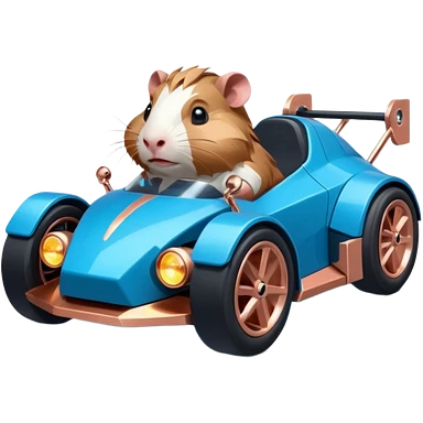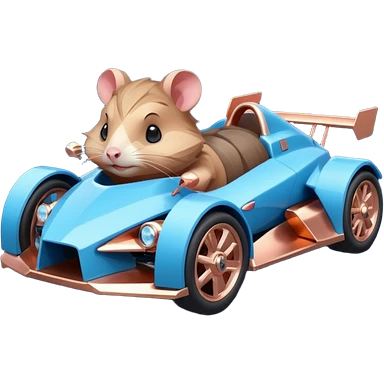 dark crystal blue and rosegold-accented faceted-body electric racing car driven by a small cute but fearless hamster with rear spoiler, roll bar, and wheely bar emoji