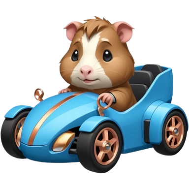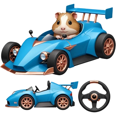 dark crystal blue and rosegold-accented faceted-body electric racing car driven by a small cute but fearless Guinea pig with rear spoiler, roll bar, and wheely bar emoji