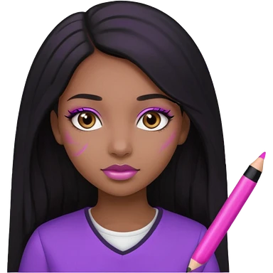 Une fille noir au cheveux lisse qui est entrain d’écrire avec un stylo rose sur un cahier violet cheveux long et lisse avec des jolis yeux et un beau makeup emoji