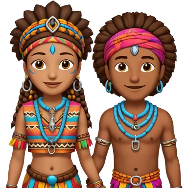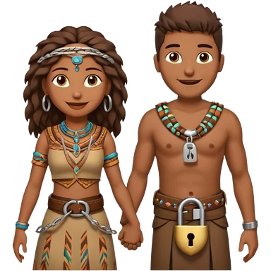 A happy tribal man holding hands with a happy tribal woman wearing a belt with a padlock emoji