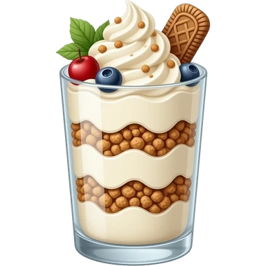 realistic -- tall parfait glass -- layered appearance alternating between whipped cream and crumbled Marie biscuit with cream and fruit emoji