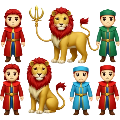 Güneş gözlüklü pantolonlu sarı kırmızı tişörtlü yeşil gözlü mavi saçlı aslan emoji | AI Emoji Generator