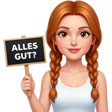sexy girl with long ginger braids and ginger eyes wearing a white tanktop is holding a black sign with ALLES GUT? written on it emoji